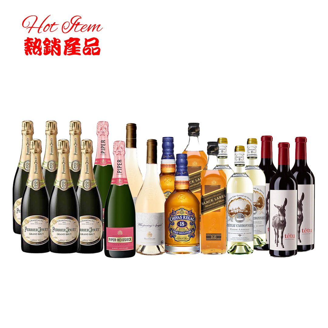 【20支優惠派對套裝】巴黎之花香檳6支 75cl, 白雪香檳(玫瑰)2支 75cl, 天使密語粉紅玫瑰酒2022 2支 75cl, 芝華士 18年2支 70cl,尊尼獲加黑牌威士忌2支 70cl, 卡邦尼詩白葡萄酒2009 3支 75cl, 雄驢紅葡萄酒2014 3支 75cl